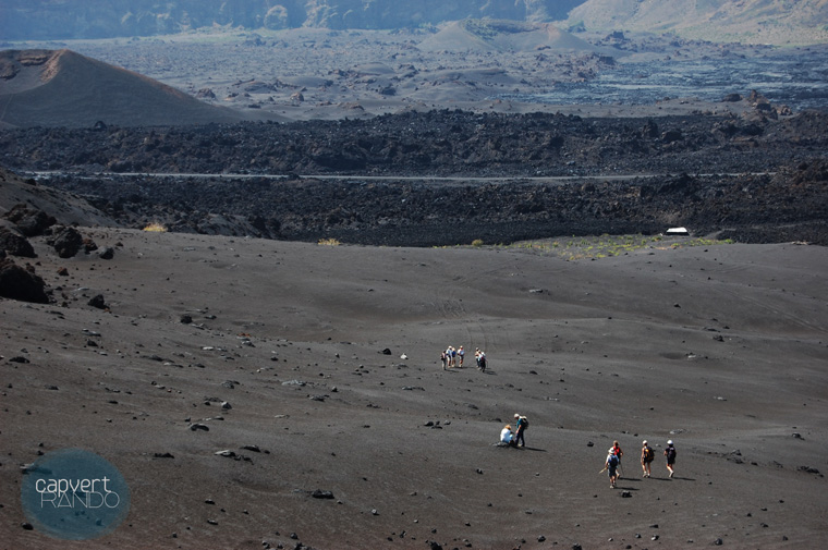 Avant l'aube nous prenons notre petit déjeuner à la bougie et nous nous restaurons avant d'entamer la plus haute étape que le Cap-Vert ait à nous proposer, à 2829 mètres. Pas à pas et avant que le soleil réchauffe notre chemin, nous montons le flanc du volcan. Arrivés au sommet, la première récompense est magnifique, avec une vue époustouflante sur tout le cratère et sur les champs de lave des éruptions récentes ou anciennes de plusieurs siècles. Mais la seconde récompense nous attend encore – la descente, inoubliable pour qui a eu la chance de dévaler cette pente de poudreuse noire !