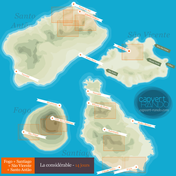Deux semaines pour partir à la découverte des joyaux perdus en plein océan Atlantique ; l’approche se fait avec l’ascension des flancs noirs de l'imposant volcan où le regard enthousiaste embrasse tout l’archipel, et où le sommet de Fogo titillant les 3000 mètres est aussi la promesse une descente débridée et vertigineuse.