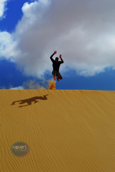 Après le plat de la plage, c'est la journée de l'escalade, avec l'ascension du point culminant de l'île, le Rocha Estancia et ses 357 mètres d'altitude. Nous déjeunons dans une petite ferme locale, entourée d'un baobab, d'amandiers et de tamariniers... un petit oasis. Nos batteries totalement rechargées, c'est plein d'énergie que nous partons en direction du fameux désert de l'île: c'est là que nous bivouaquerons cette nuit, mais avant cela nous comptons bien profiter des dunes somptueuses pour y rouler encore et encore. Après tout, dans le désert, on peut redevenir de petits enfants, personne n'est là pour nous gronder.